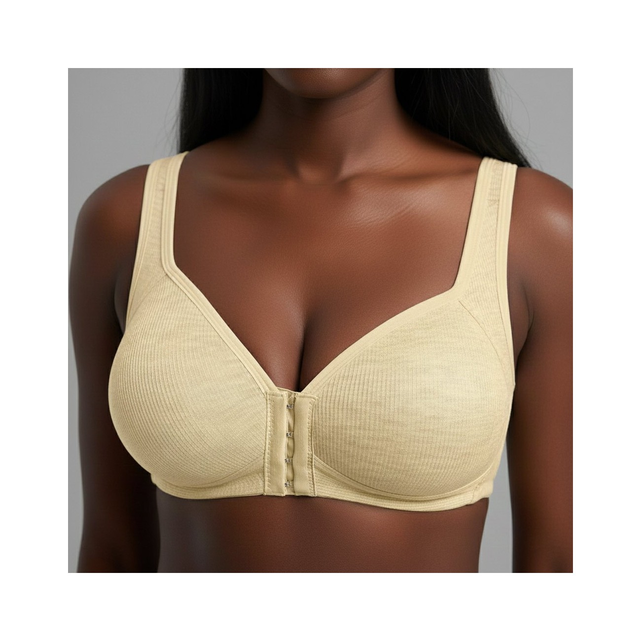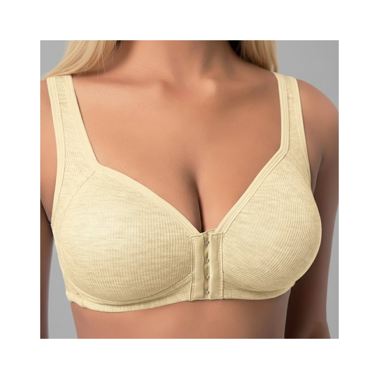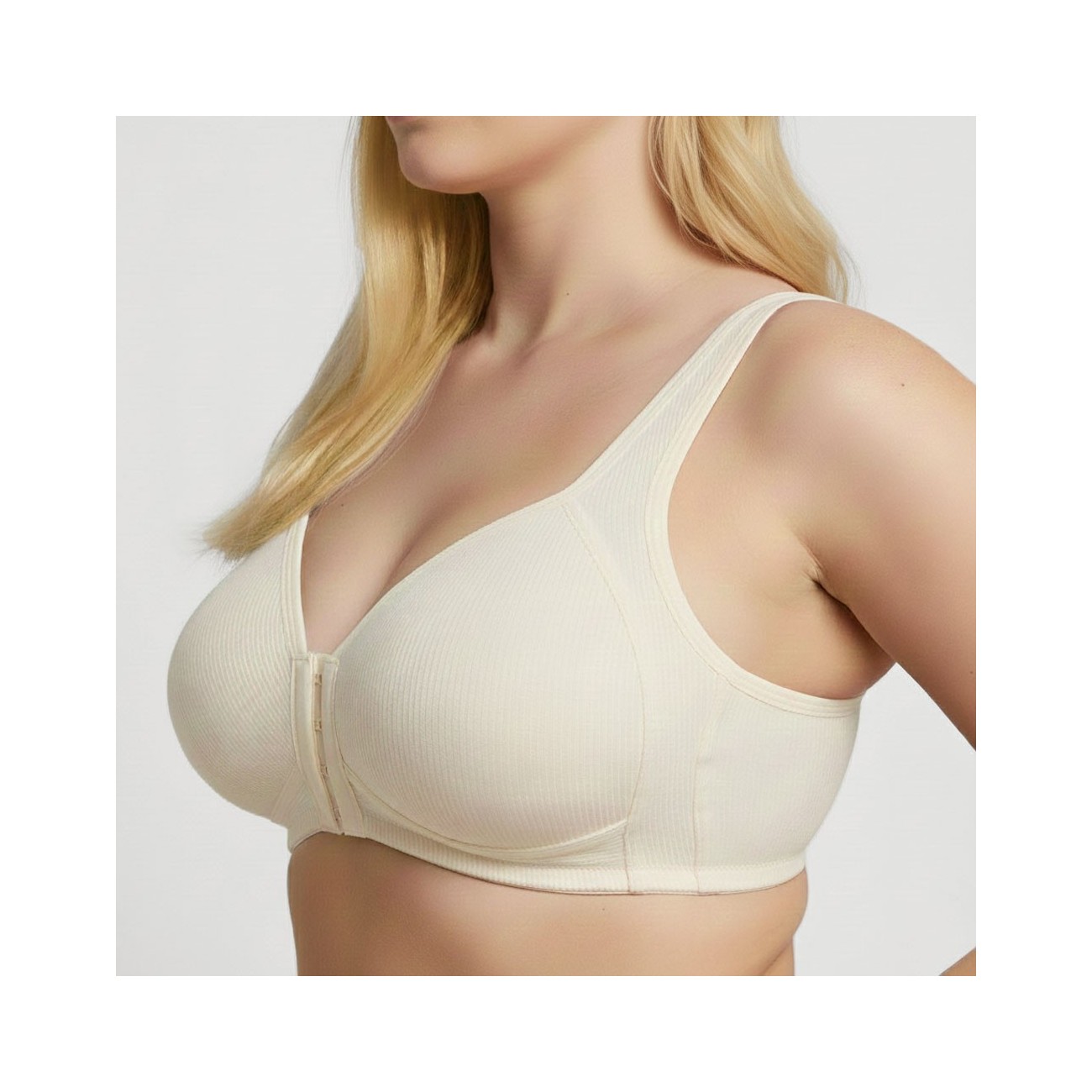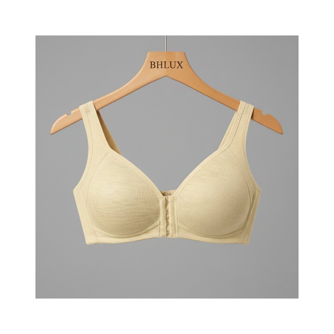 Der BHLUX Aria Komfort-BH mit Vorderverschluss in Creme wurde für Frauen entwickelt, die sich jeden Tag bequem und sicher fühlen möchten. Das bügellose Design bietet gleichmäßigen Halt ohne Druckstellen und unterstützt natürliche Bewegungsfreiheit.