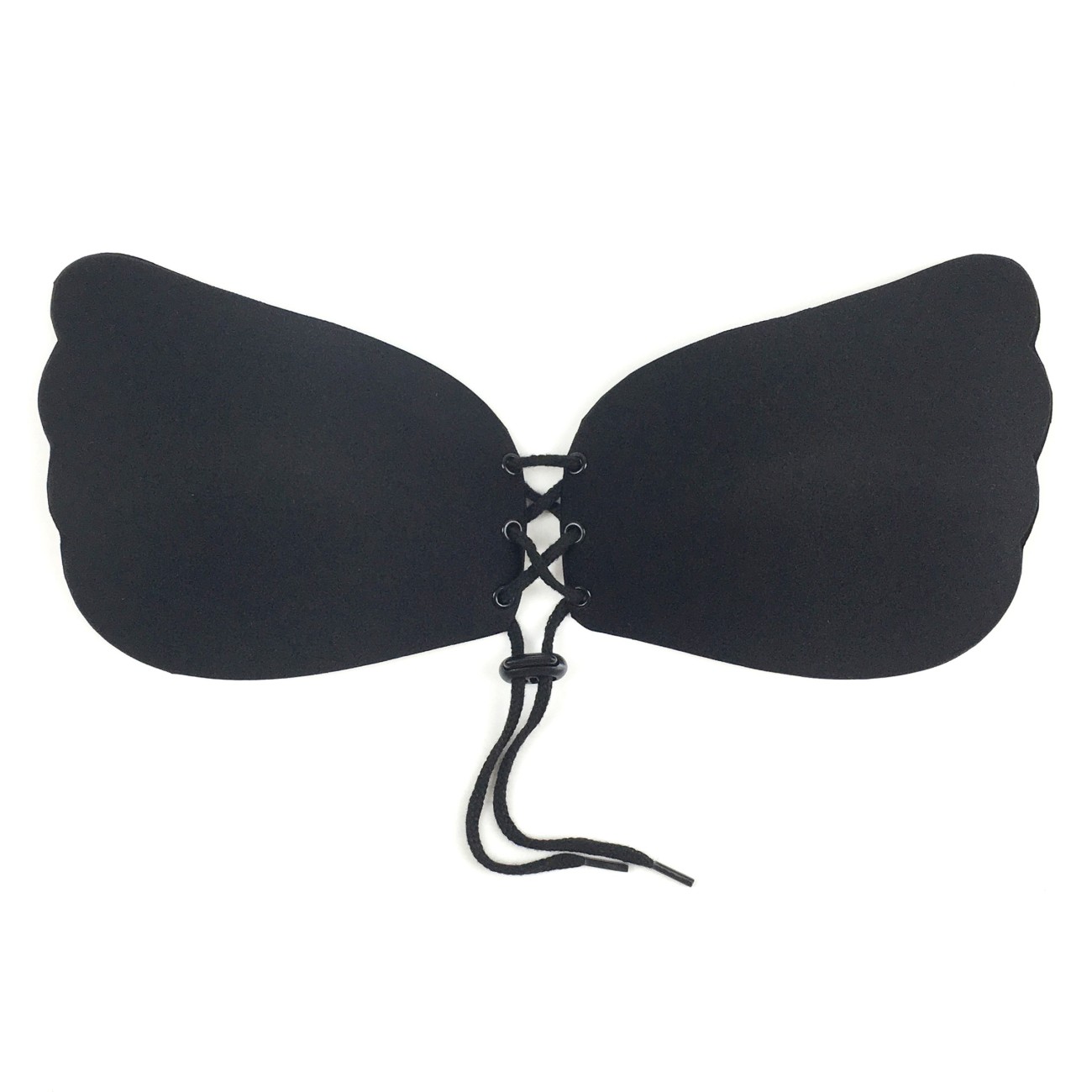 Schwarzer Klebe BH mit praktischer Frontschnürung für ein individuell einstellbares Dekolleté. Selbstklebend, wiederverwendbar und perfekt für rückenfreie und schulterfreie Outfits. Erhältlich in den Größen A bis H.